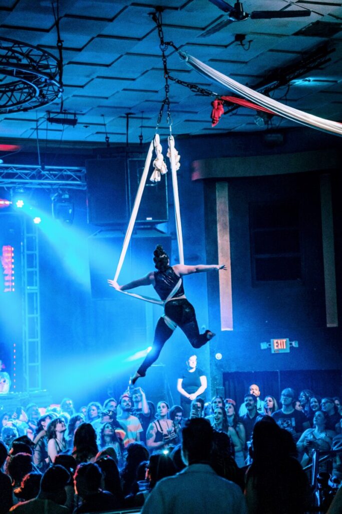 Shelby began her aerial journey in 2021 and she instantly fell in love. She currently trains and teaches at Suspended Animation Aerials with her favorite coach, Heather. She has trained extensively on trapeze, sling, silks, duo trapeze, and lollipop lyra. She loves interacting with the crowd while flying high above them. Shelby has performed at a variety of events, including Communion at Aloft Circus Arts in Chicago, Museum by Moonlight at the Children’s Museum, and Girl Pride at the Vogue.