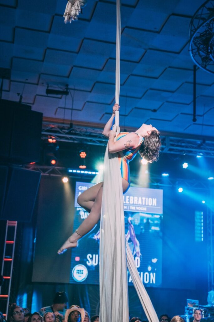 Lauren trains on silks, lyra, rope and lollipop lyra. She found a love for aerial 10 years ago then returned back to it in the past 4 years. Lauren loves to perform powerful skills with fun drops and meaningful choreography that that leaves the audience entertained as surprised. Lauren has performed at the Harrison Center, Indy’s Big Gay Markets, and Westfield’s Halloween Grande Junction Plaza.
