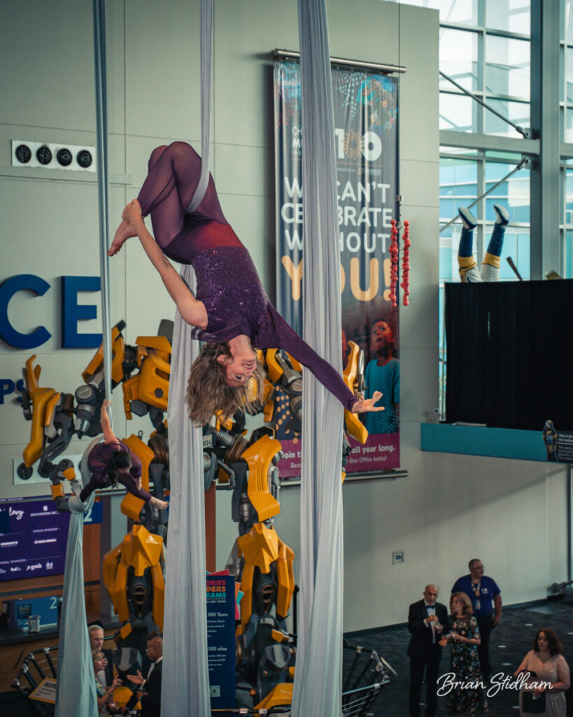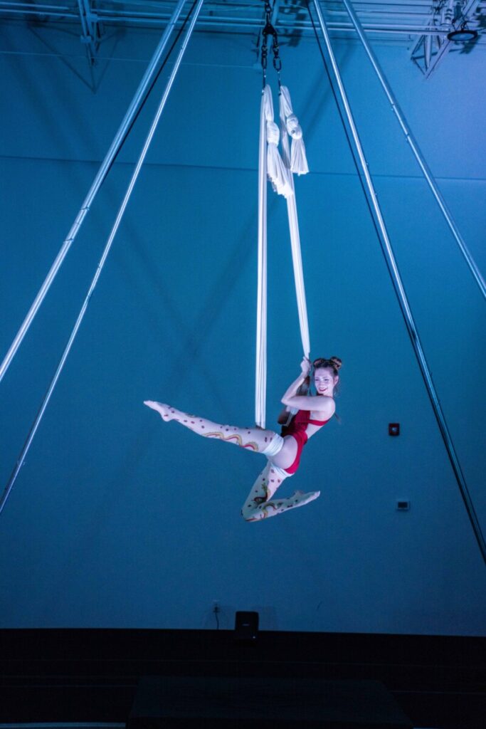 Katelyn started her aerial journey in 2017. Her love of dance started as a child but her love of performing started backstage as a coach, developing choreography for her students and managing recitals. The love of being involved in shows evolved into a love of performing herself. She loves being able to connect with audiences, express herself, and tell a story through movement every time she’s on stage. Her primary apparatuses are silks and sling. She has performed at the Harrison Center and in local shows.