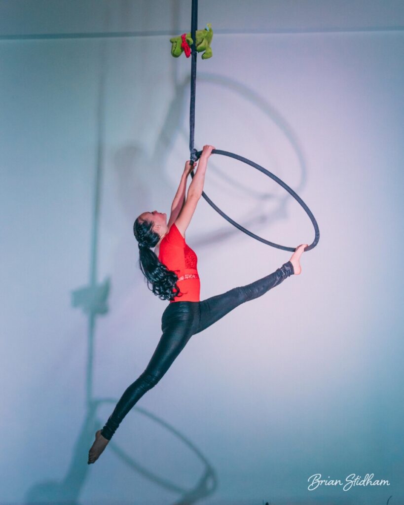 Erilyn found her love for aerial after college and has been obsessed ever since! Though she focuses primarily on fabric apparatuses, she also trains trapeze, rope, and lollipop. Erilyn has performed at The Harrison Center, Girl Pride at the Vogue, and the Children’s Museum Second Century Soiree.